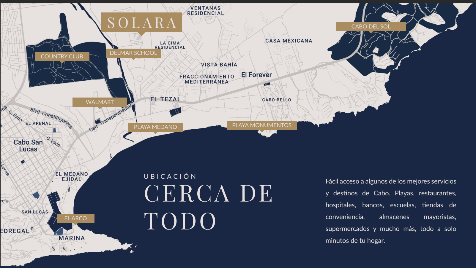 Solara es una comunidad residencial en El Tezal que propone una forma de vivir en Los Cabos con mayor equilibrio, amplitud y sofisticación. Su arquitectura contemporánea y su trazo cuidadosamente planeado generan una experiencia donde el orden y la privacidad conviven de manera natural con la calidez y la conexión entre espacios. Solara no solo se percibe, se siente confiable. Esa certeza que distingue a una decisión inmobiliaria bien tomada: una visión sólida, una ejecución clara y un valor a largo plazo en el que puede confiar plenamente.
