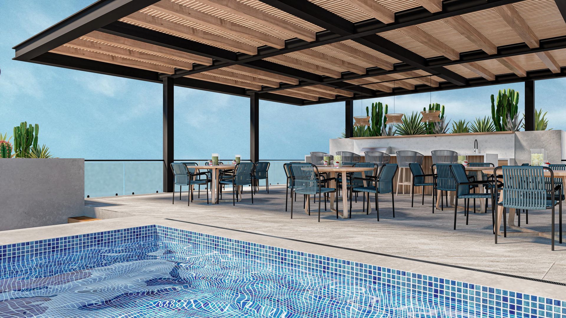 Más de 600 m² dedicados a amenidades y rooftop: espacios para convivir, descansar y disfrutar el aire marino con vista abierta.